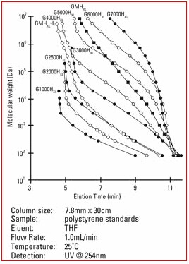 4. Hxl型柱屬于常規GPC色譜柱,尺寸為7.8mm ID ×30cm。大多數HPLC系統無需進行特殊的優化(針對柱外峰展效應),即可使用常規的GPC色譜柱。
